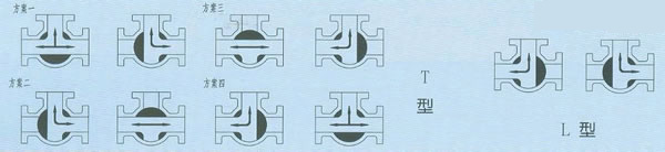 備注:三通球閥一般采用兩閥座結構,如流向圖A所示兩種工況。選用兩面閥座L型結構(即Q44型)。流向B中①和④兩種工況亦可選用兩閥座T型結構(即Q45型)。流向圖B②和③兩種工況必須選用四閥認T型結構(即Q45型)。其余工況也可以先用四閥座結構,但在訂貨合同中注明閥座結構。如閥門有其它要求請參閱樣本《閥門的型號編制方法》填寰相應的要求代號。